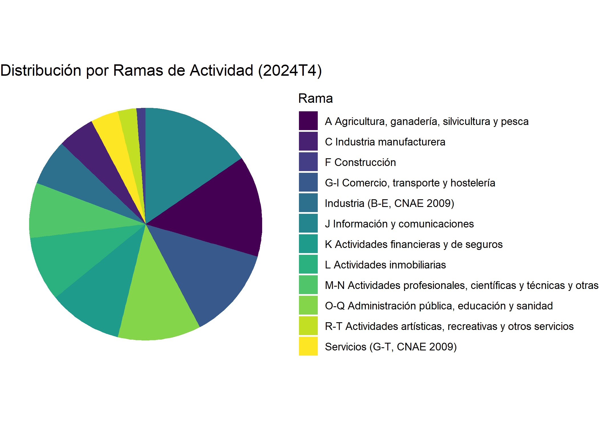 df3 <- rio::import("./datos/actividad.csv")datos_filtrados <- df3 %>%filter(Periodo =="2024T4",`Niveles y Tasas`=="Dato base", Población =="Personas",`Situación profesional`=="Ocupado/a",`Tipo de dato`=="Datos ajustados de estacionalidad y calendario",`Ramas de actividad`!="Total",`Ramas de actividad`!="Total Nacional")ggplot(datos_filtrados, aes(x ="", y = Total, fill =`Ramas de actividad`)) +geom_bar(stat ="identity", width =1) +coord_polar("y", start =0) +scale_fill_viridis_d(option ="viridis") +theme_void() +labs(title ="Distribución por Ramas de Actividad (2024T4)",fill ="Rama")
