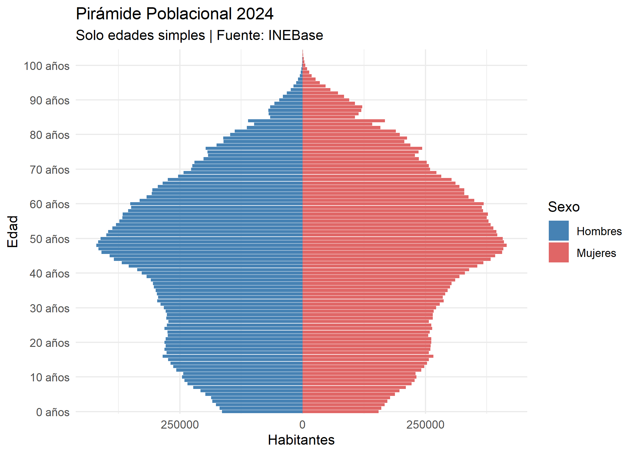 ---title: "Algunos datos sobre España"description: | Análisis de algunas variables macroeconómicas de Españaauthor: - name: Juan Carlos Perez Hernando affiliation: Universitat de València affiliation-url: https://www.uv.esdate: 2026-01-03 #--categories: [trabajo BigData, analisis] #--image: "./imagenes/escudo.png"title-block-banner: true #- {true, false, "green","#AA0000"}title-block-banner-color: "white" #-"#FFFFFF" toc-depth: 3smooth-scroll: trueformat: html: link-external-newwindow: truecode-tools: truecode-link: true---## IntroduccionEl presente trabajo tiene como propósito analizar de manera integral los pilares que configuran la realidad macroeconómica de España en un contexto actual. Para ello, se examinan las variables fundamentales que determinan tanto la capacidad productiva del país como el bienestar de sus ciudadanos, permitiendo identificar las tendencias de crecimiento y los desafíos estructurales a los que se enfrenta la nación.Para garantizar la precisión y el rigor técnico del análisis, este estudio se fundamenta en la explotación de las bases de datos del Instituto Nacional de Estadística (INE). A través de la interpretación de indicadores oficiales.No obstante, para hacer posible todo el manejo y tratado de datos es preciso disponer de algunas de las siguientes librerias en el programa Rstudio.```{r}library(quantmod) #install.packages("quantmod")library(dplyr)library(ggplot2)library(tidyverse)library(leaflet) #install.packages("leaflet")library(eurostat)library(rio)library(pxR) library(mapSpain)library(sf)library(scico)library(plotly)library(reactable) #install.packages("scico")library(ggthemes)library(gganimate) library(janitor)```---## Ubicación de la peninsula y sus provinciasEspaña se sitúa en el extremo suroeste de Europa, ocupando la mayor parte de la Península Ibérica. Su ubicación estratégica la convierte en un puente natural entre dos continentes (Europa y África) y dos masas de agua fundamentales para el comercio global: el Océano Atlántico y el Mar Mediterráneo. Esta posición geográfica ha sido, históricamente, uno de los factores determinantes de su apertura exterior y su especialización económica en sectores como la logística y el turismo.Desde el punto de vista económico, la distribución territorial es clave para entender las disparidades en el PIB y el empleo que se analizan en este trabajo. El Estado se organiza en 17 Comunidades Autónomas y 2 Ciudades Autónomas (Ceuta y Melilla), que a su vez se integran en un total de 50 provincias.```{r}datos_provincias <-data.frame(nombre =c("Álava", "Albacete", "Alicante", "Almería", "Asturias", "Ávila", "Badajoz", "Barcelona", "Burgos", "Cáceres","Cádiz", "Cantabria", "Castellón", "Ciudad Real", "Córdoba", "A Coruña", "Cuenca", "Girona", "Granada", "Guadalajara","Guipúzcoa", "Huelva", "Huesca", "Islas Baleares", "Jaén", "León", "Lleida", "Lugo", "Madrid", "Málaga","Murcia", "Navarra", "Ourense", "Palencia", "Las Palmas", "Pontevedra", "La Rioja", "Salamanca", "Segovia", "Sevilla","Soria", "Tarragona", "Santa Cruz de Tenerife", "Teruel", "Toledo", "Valencia", "Valladolid", "Vizcaya", "Zamora", "Zaragoza", "Ceuta", "Melilla" ),lat =c(42.8467, 38.9944, 38.3452, 36.8340, 43.3603, 40.6567, 38.8794, 41.3851, 42.3440, 39.4765,36.5271, 43.4623, 39.9864, 38.9848, 37.8882, 43.3623, 40.0704, 41.9794, 37.1773, 40.6286,43.3128, 37.2614, 42.1362, 39.5693, 37.7796, 42.5987, 41.6176, 43.0121, 40.4168, 36.7213,37.9922, 42.8125, 42.3358, 42.0095, 28.1235, 42.4310, 42.4627, 40.9688, 40.9429, 37.3891,41.7640, 41.1189, 28.4636, 40.3457, 39.8628, 39.4699, 41.6523, 43.2630, 41.5033, 41.6488, 35.8894, 35.2923 ),lng =c(-2.6730, -1.8585, -0.4810, -2.4637, -5.8448, -4.7004, -6.9706, 2.1734, -3.6969, -6.3722,-6.2886, -3.8099, -0.0513, -3.9274, -4.7794, -8.4115, -2.1374, 2.8214, -3.5986, -3.1619,-1.9812, -6.9447, -0.4085, 2.6502, -3.7849, -5.5671, 0.6206, -7.5581, -3.7038, -4.4214,-1.1307, -1.6458, -7.8639, -4.5283, -15.4363, -8.6444, -2.4450, -5.6635, -4.1080, -5.9845,-2.4688, 1.2445, -16.2518, -1.1065, -4.0273, -0.3774, -4.7284, -2.9350, -5.7463, -0.8891, -5.3198, -2.9381 ))# 2. Creamos el mapa usando esos datosposicion_espana <-leaflet(data = datos_provincias) %>%addTiles() %>%setView(lng =-3.7038, lat =40.4168, zoom =6) %>%addMarkers(lng =~lng,lat =~lat,popup =~nombre,label =~nombre )# 3. Mostrar el resultadoposicion_espana```---Podemos observar en esta imagen el relieve::: {.column-margin}{fig-align="center"}:::---## 1. Dinámica demográficaEl factor humano es la base de cualquier sistema productivo. Según los últimos datos de la Estadística Continua de Población del INE, España ha consolidado un cambio de tendencia demográfico que impacta directamente en las variables de empleo y consumo.Para entender la economía española actual, es necesario desglosar este indicador en dos puntos críticos:---### 1.1. Interpretacion de la estructura por edadesEl estudio de la estructura demográfica es fundamental para entender la sostenibilidad económica de España. Al observar la Pirámide Poblacional (INE), se hace evidente que el país atraviesa un proceso de maduración demográfica caracterizado por una forma de "bulbo" o "paraguas", donde la mayor parte de la población se concentra en cohortes de edad avanzada.A partir de los datos visualizados, podemos extraer tres conclusiones económicas críticas:- El estrechamiento en los tramos de 0 a 20 años refleja una baja tasa de natalidad persistente. A largo plazo, esto se traduce en una menor entrada de jóvenes al mercado laboral, lo que limita el crecimiento potencial del PIB.- El mayor número de habitantes se encuentra actualmente en la franja de los 45 a 60 años. Este grupo representa el grueso de la fuerza laboral actual y la mayor capacidad de consumo, pero se encamina rápidamente hacia la jubilación.- La notable presencia de población por encima de los 80 años confirma la alta esperanza de vida en España. Desde una perspect