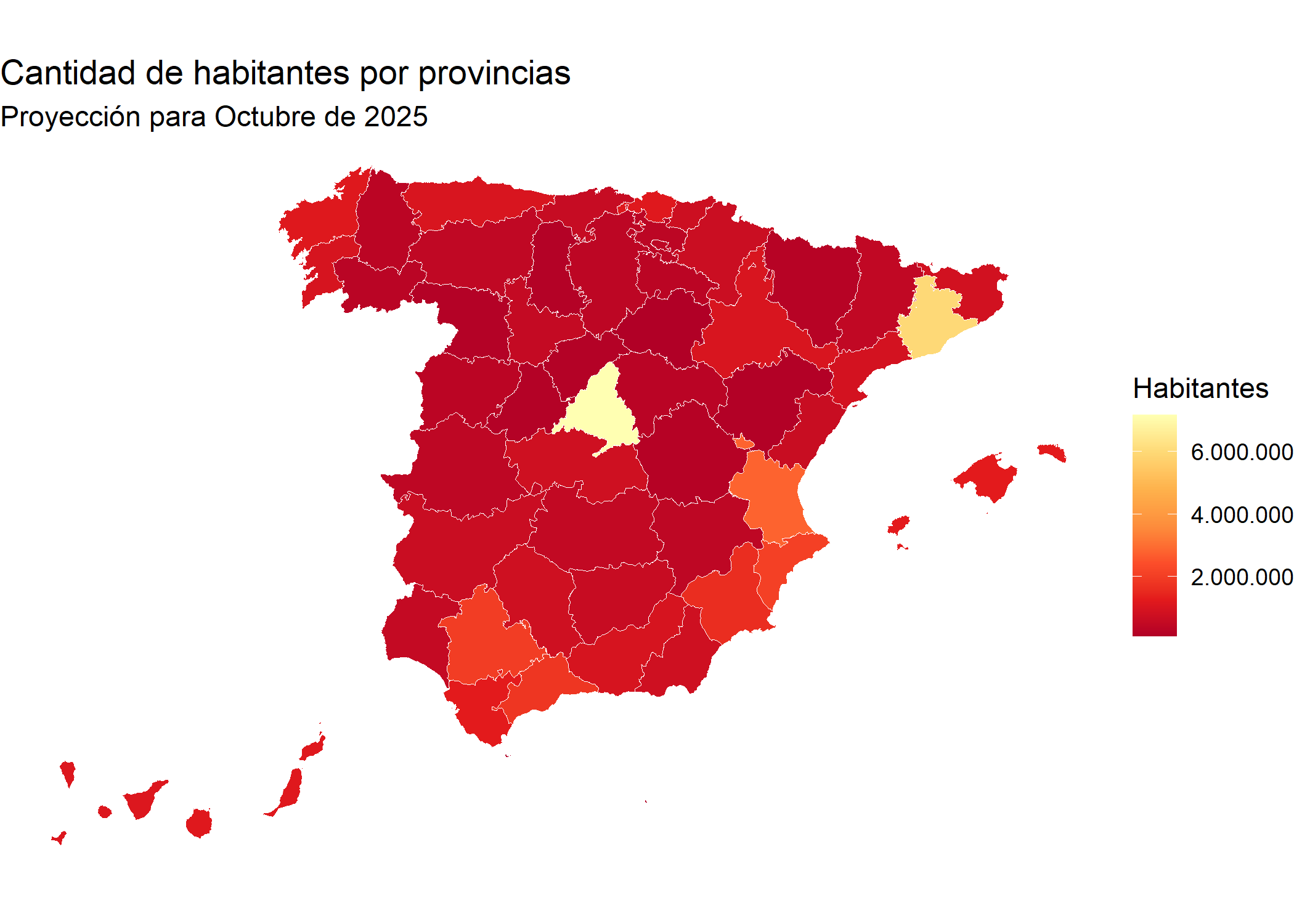 El mapa permite visualizar una tendencia histórica que se mantiene vigente en 2025: la población tiende a concentrarse en la periferia costera. Provincias como Valencia, Alicante, Málaga y Sevilla aparecen con una tonalidad más clara (naranja), indicando poblaciones que oscilan entre los 2 y 4 millones de habitantes. Estas zonas son las que presentan un mercado de trabajo más dinámico vinculado al sector servicios y al turismo.