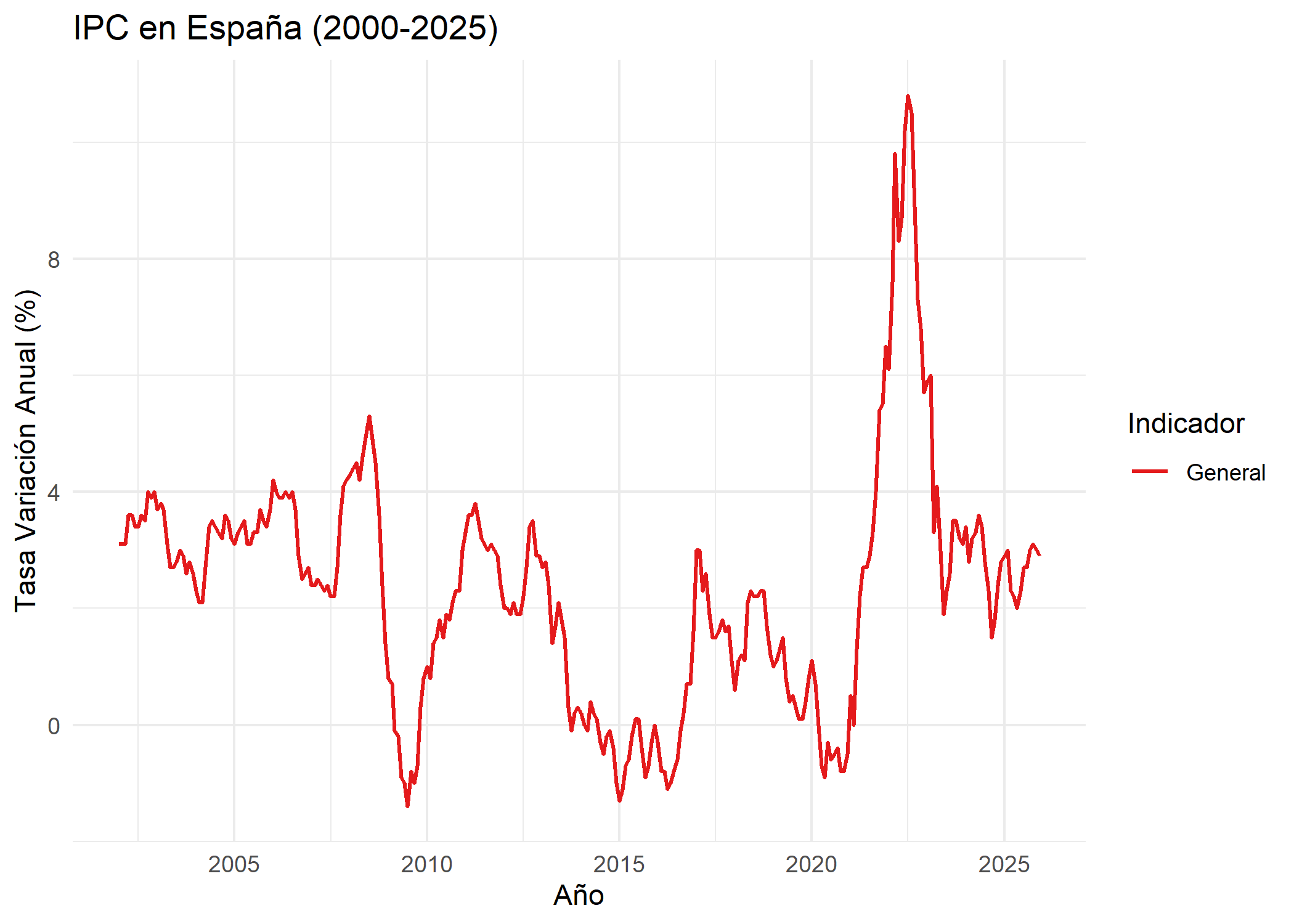 df <- rio::import("./datos/ipc.csv")# 2. Preparamos los datos filtrando ambos a la vez para poder comparardf_dinamico <- df %>%filter(`Grupos ECOICOP`%in%c("Índice general", "Índice general sin alimentos no elaborados ni productos energéticos"),`Tipo de dato`=="Variación anual") %>%mutate(fecha =ym(Periodo),Valor =as.numeric(str_replace(Total, ",", ".")),Indicador =ifelse(str_detect(`Grupos ECOICOP`, "sin alimentos"), "Subyacente", "General") ) %>%arrange(fecha) %>%drop_na(Valor)p <-ggplot(df_dinamico, aes(x = fecha, y = Valor, color = Indicador, group = Indicador)) +geom_line(linewidth =0.7) +scale_color_manual(values =c("General"="#E41A1C", "Subyacente"="#377EB8")) +labs(title ="IPC en España (2000-2025)",y ="Tasa Variación Anual (%)",x ="Año" ) +theme_minimal()print(p)