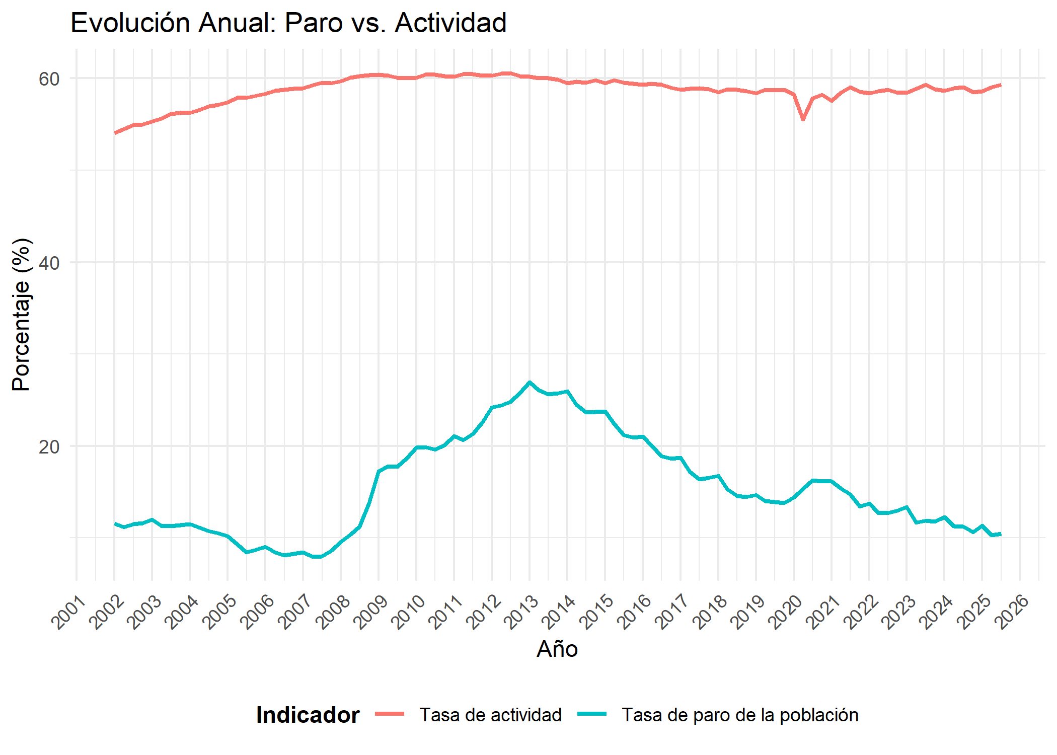 df2 <- rio::import("./datos/tasa_actividad.csv")df_paro <- df2 %>%clean_names()df_final <- df_paro %>%filter(tasas %in%c("Tasa de paro de la población", "Tasa de actividad"))df_final <- df_final %>%filter(provincias =="Total Nacional", sexo =="Ambos sexos")df_grafico <- df_final %>%mutate(fecha =yq(periodo),total =as.numeric(str_replace(total, ",", ".")) )ggplot(df_grafico, aes(x = fecha, y = total, color = tasas)) +geom_line(linewidth =1) +scale_x_date(date_breaks ="1 year", date_labels ="%Y" ) +theme_minimal() +labs(title ="Evolución Anual: Paro vs. Actividad",x ="Año",y ="Porcentaje (%)",color ="Indicador" ) +theme(axis.text.x =element_text(angle =45, hjust =1),legend.position ="bottom",legend.title =element_text(face ="bold") )