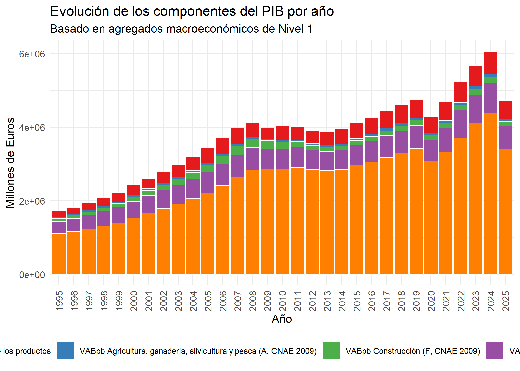 df2 <- rio::import("./datos/pib_anual.csv")# 1. Preparación de los datos (Igual que antes)df_plot <- df2 %>%mutate(Anio =substr(Periodo, 1, 4),Total =as.numeric(gsub("\\.", "", Total))) %>%filter(!grepl("Producto interior bruto", `Agregados macroeconómicos: Nivel 1`)) %>%group_by(Anio, `Agregados macroeconómicos: Nivel 1`) %>%summarise(Valor_Anual =sum(Total, na.rm =TRUE), .groups ='drop')# 2. Gráfico con corrección de escala y parámetrosggplot(df_plot, aes(x = Anio, y = Valor_Anual, fill =`Agregados macroeconómicos: Nivel 1`)) +geom_bar(stat ="identity", position ="stack", color ="white", linewidth =0.2) +scale_fill_brewer(palette ="Set1") +labs(title ="Evolución de los componentes del PIB por año",subtitle ="Basado en agregados macroeconómicos de Nivel 1",x ="Año",y ="Millones de Euros",fill ="Componente") +theme_minimal() +theme(axis.text.x =element_text(angle =90, vjust =0.5),legend.position ="bottom",legend.text =element_text(size =8) )